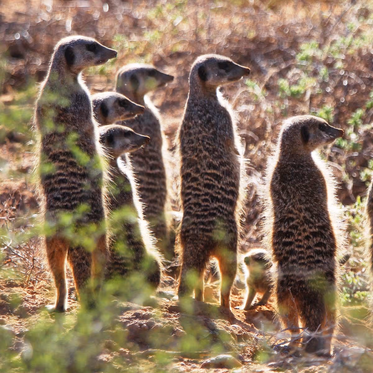 Joignez-vous à nous tous les jours à l'aube pour observer ces incroyables créatures sauvages habituées sortir de leurs terriers, juste à temps pour profiter du soleil avant de vaquer à leurs activités quotidiennes. Les suricates sont également appelés Suricate ou, en allemand, Erdmännchen et sont connus pour faire partie de la famille des mangoustes.