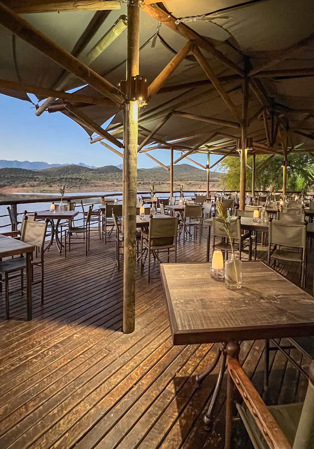 Ons restaurant breidt zich ook uit naar het houten dek, met uitzicht op onze waterpoel van 5 ha vol met grote vissen, schildpadden en nijlpaarden. Als je geluk hebt, zie je misschien zelfs olifanten en ander wild aan de overkant.